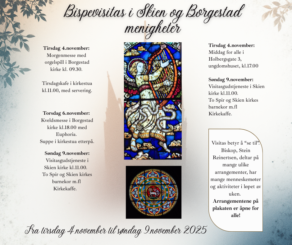 Velkommen til bispevisitas i Skien og Borgestad menigheter fra 04.november til 09.november. Sjekk ut plakater for arrangementer som er åpne for alle gjennom uka.